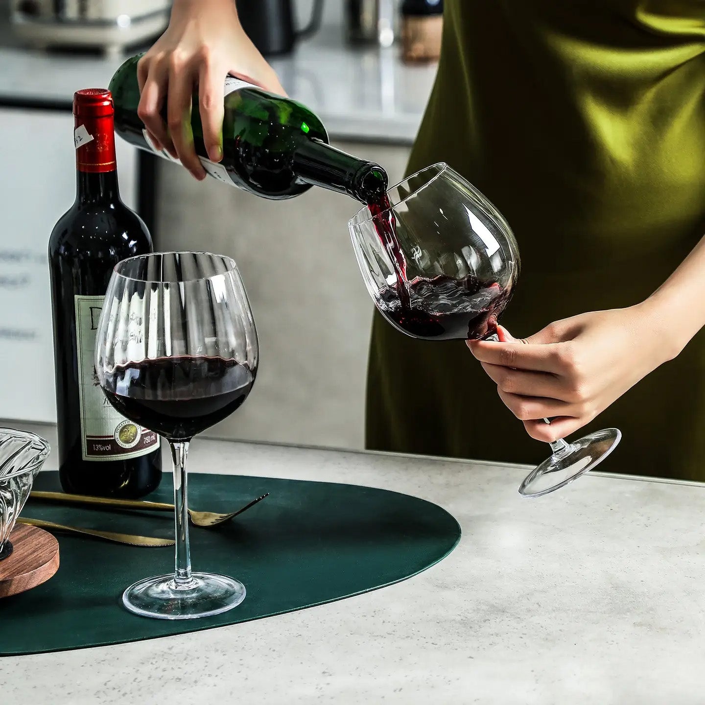 Each glass is masterfully shaped and hand-blown by artisans using traditional methods to create a contemporary, exceptionally clear round body and slender stem that gracefully showcases red wines. Sophisticated with a sparkling ribbed optic finish, wine glasses add visual interest and high style to the table or home. Each glass has an ultra-thin rim that allows you enjoy every sip, while the elegant long stem fits effortlessly in your hands. Features Handcrafted with lead-free high-quality glass by skilled artisans. Transparent, tasteless, no pollution, non-toxic for safe using.