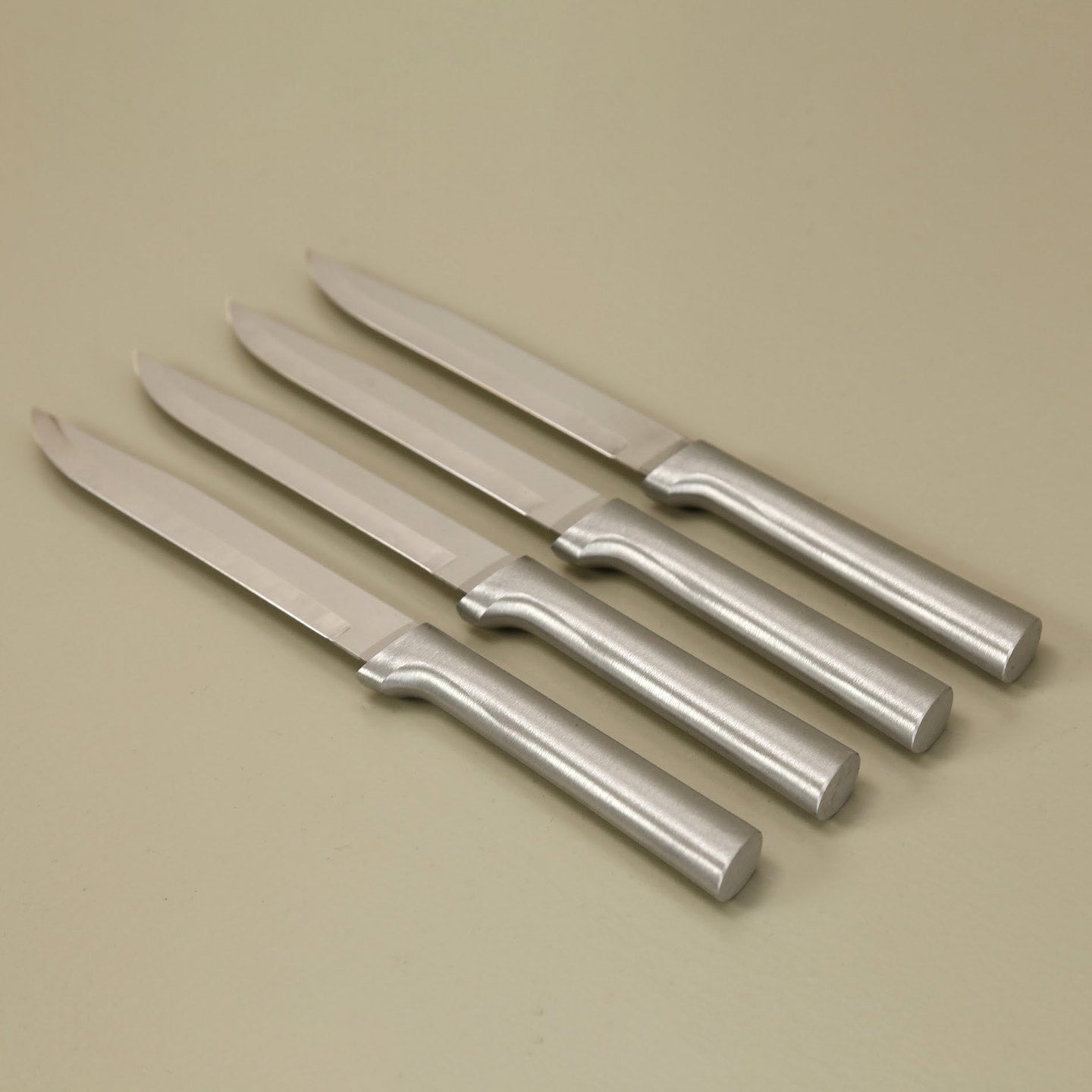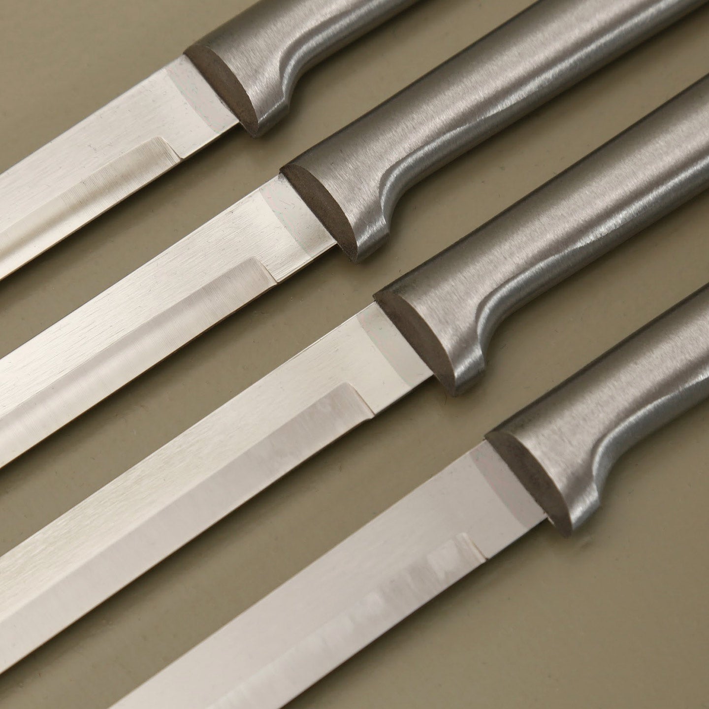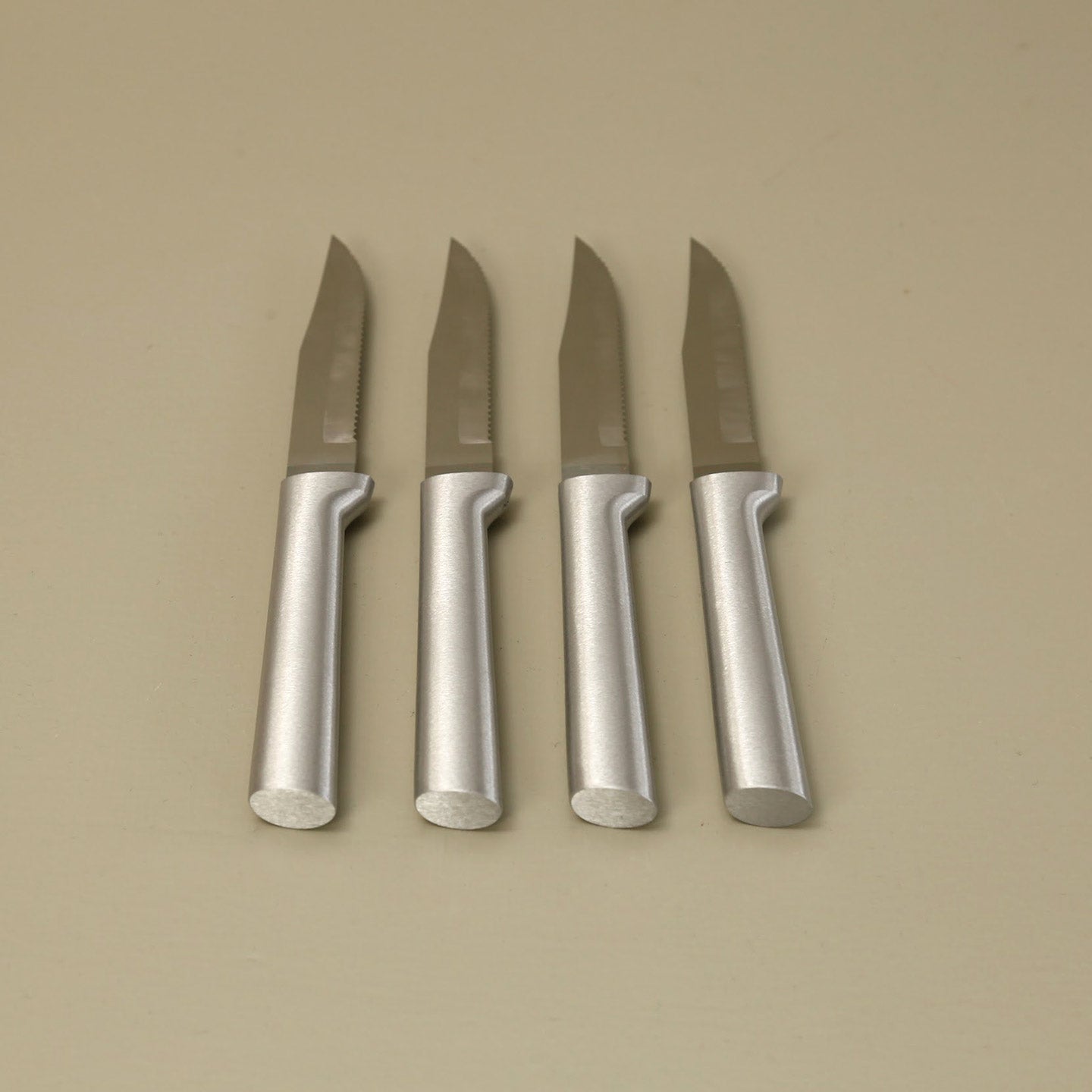This silver handle utility/steak knives gift set of four makes a wonderful gift for anyone because everyone needs great steak knives! The non-serrated blades glide effortlessly through all types of meat, providing a smooth, clean cut. Handcrafted from surgical-quality, T420 high-carbon stainless steel for a lifetime of durability then hollow ground for incredible sharpness. The silver handles are constructed from permanently cast brushed aluminum for remarkable durability and a beautiful satin finish.
