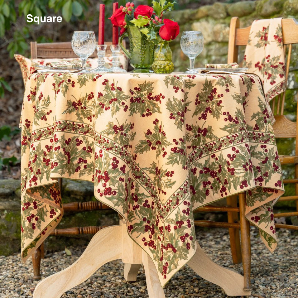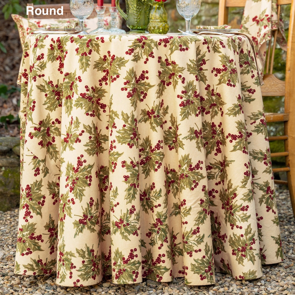 Pure 100% cotton table covering in a sophisticated ecru shade with classic holiday greenery design, perfect for adding warmth and elegance to your dining space.